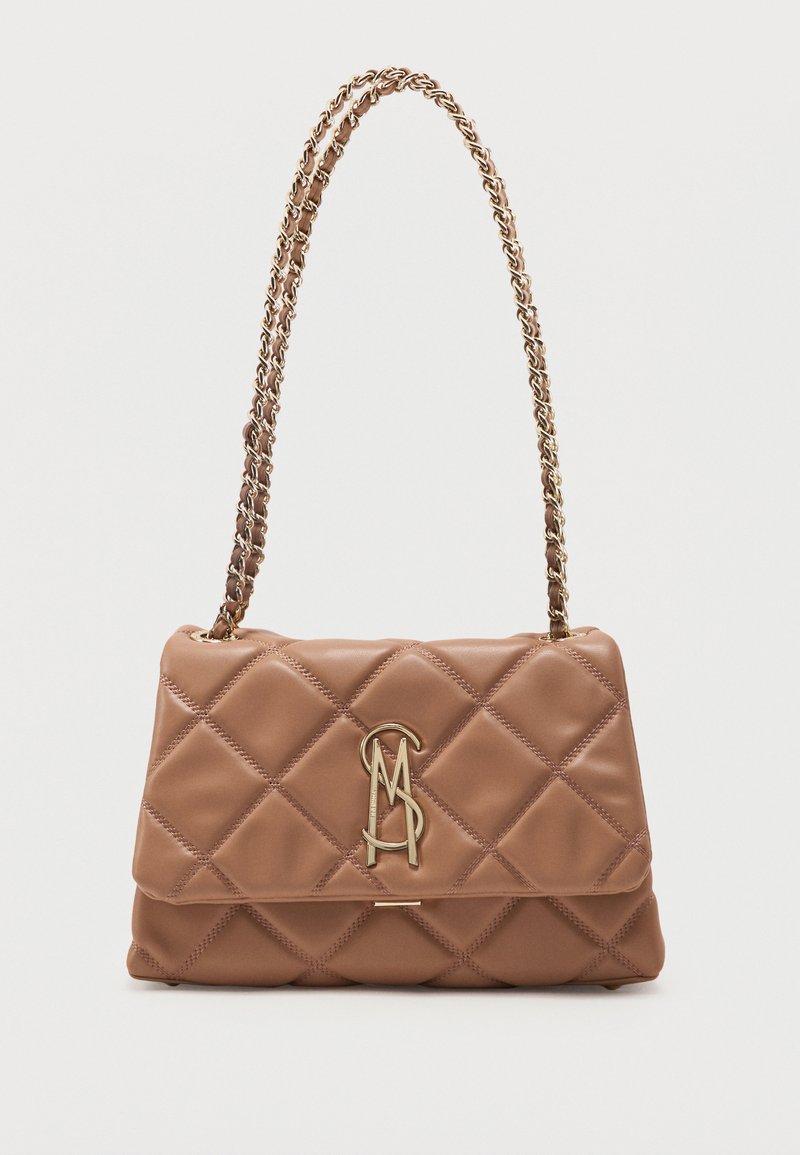 Καφέ δερμάτινη τσάντα με επένδυση σε σχέδιο καπιτονέ, με χρυσή αλυσίδα-λαιμόκοψη και χρυσό μεταλλικό λογότυπο στην εμπρός πλευρά της πόρπης.