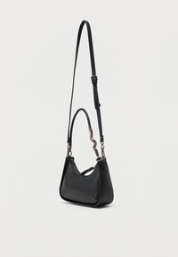 Μαύρη τσάντα Steve Madden από υφή δέρματος με καμπύλο φερμουάρ στην κορυφή, κοντή ασύμμετρη λαβή από μέταλλο και δέρμα, και αποσπώμενο λουράκι.