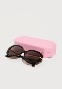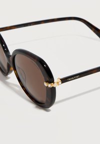 Οβάλ γυαλιά ηλίου με σχέδιο χελωνόσκεπης, σκούρους καφέ φακούς και χρυσές κρυστάλλινες λεπτομέρειες στις αρθρώσεις του σκελετού.