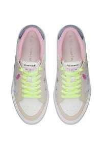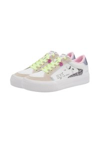 Λευκό χαμηλό αθλητικό παπούτσι με μπεζ λεπτομέρειες, κορδόνια νέον κίτρινου, ροζ γοργόνα με σχέδιο λουλουδιών, λαμπερό τακούνι και χειρόγραφο κείμενο κοντά σε λουλουδένια σχέδια.