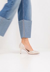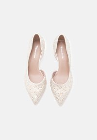 Λευκές γόβες με μυτερή μύτη, διακοσμημένες με μικρούς πέρλες και ρινόστενς. Διαθέτουν λεπτό τακούνι και ανοιχτό κόψιμο από τη μία πλευρά.