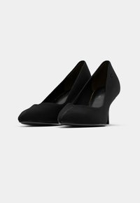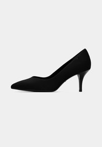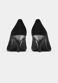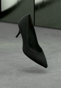 Μαύρο ψηλοτάκουνο παπούτσι με μυτερή μύτη να αιωρείται πάνω σε γκρι χαλιού με φόντο έναν σκοτεινό πράσινο τοίχο.