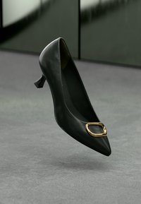 Μαύρη δερμάτινη γόβα με αιχμηρή μύτη και μικρό γεωμετρικό τακούνι, διακοσμημένη με χρυσή οβάλ αγκράφα στο κουνάκι. Λείος υφή και κομψός σχεδιασμός.