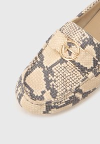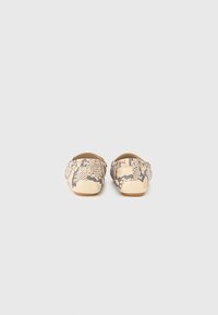 Μοκασίνια με σχέδιο φολιδωτού δέρματος σε μπεζ και μαύρο, με επίπεδη σόλα, ραφές και στρογγυλεμένη μύτη. Υφή με διακοσμητικά στοιχεία.