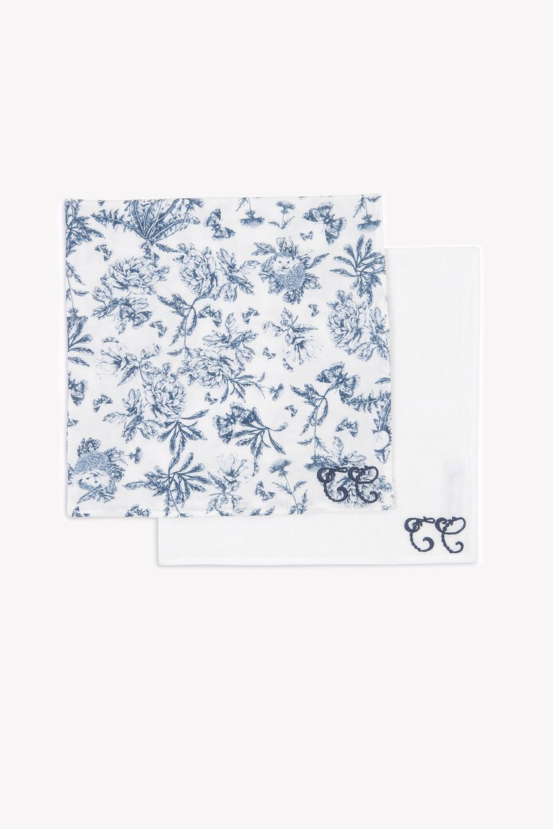 Δύο διπλωμένα βαμβακερά μαντιλάκια, ένα λευκό με μπλε λουλουδάτο σχέδιο και ένα απλό λευκό, και τα δύο με σκούρα μπλε κεντημένα αρχικά.