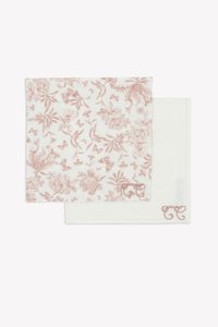 Λευκό ύφασμα με μπλε βοτανικό σχέδιο και κεντημένα αρχικά "C F" σε όμορφο στυλ σε δύο γωνίες.