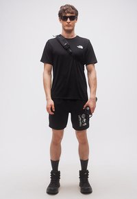 Νεαρός άνδρας που στέκεται μπροστά φορώντας μαύρο T-shirt The North Face και μαύρο σορτς με αντίστοιχα γραφικά λογότυπα.