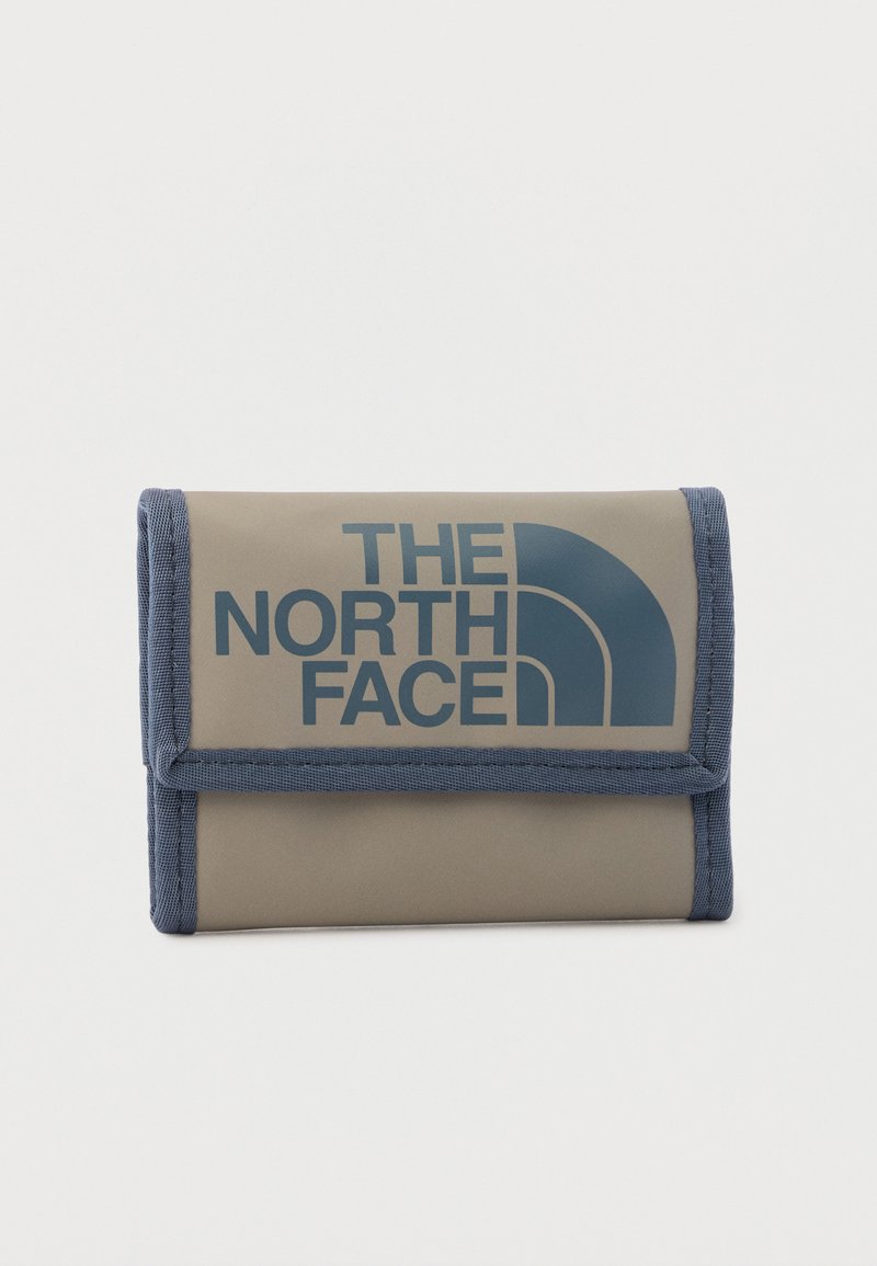 Μικρό συμπαγές πορτοφόλι από μπεζ και μπλε ύφασμα με το λογότυπο The North Face τυπωμένο σε μεγάλες μπλε γράμματα στην μπροστινή πτέρυγα.