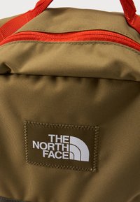 Πολύχρωμο σακίδιο πλάτης σε πράσινο και καφέ με κόκκινους φερμουάρ και χερούλι, μπροστινή τσέπη, πλαινές τσέπες από δίχτυ, και το λογότυπο "The North Face" στο μπροστινό μέρος.