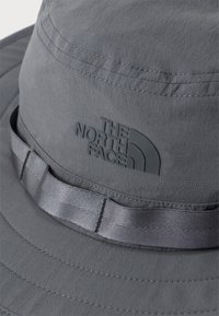 Σκούφο εξωτερικού χώρου σε σκούρο γκρι με ευρύ γείσο, ρυθμιζόμενο κορδόνι πηγουνιού και λογότυπο The North Face στο πλάι, σχεδιασμένος για προστασία από τον ήλιο.