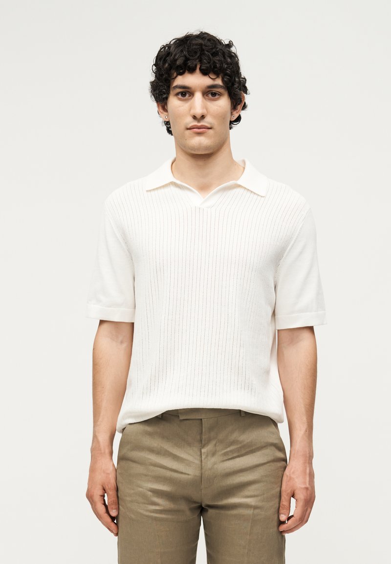 Λευκό πλεκτό πόλο με κοντό μανίκι, ριμπ υφή και ανοιχτό V-λαιμόκοψη, εμφανίζεται επίπεδο σε ανοιχτό φόντο.