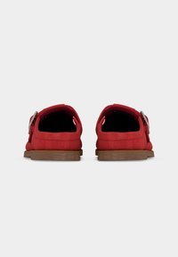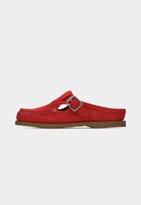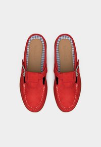 Κόκκινο μοκασίνι από σουέντ με ασημένια αγκράφα, εσωτερική επένδυση με μπλε καρό σχέδιο, λευκά γαζιά και ανοιχτό καφέ σόλα σε αντανακλαστικό πάτωμα.