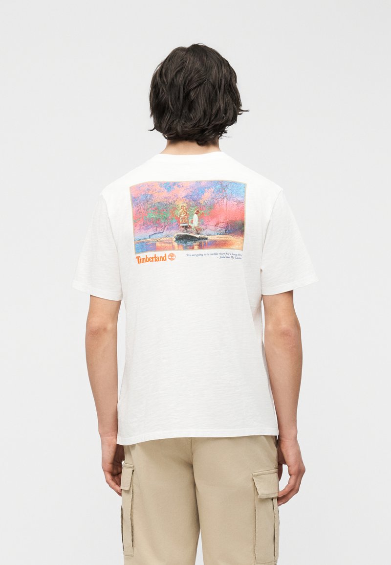 Άτομο που φοράει λευκό t-shirt Timberland με πολύχρωμη εκτύπωση vintage στιλ δύο ατόμων που ψαρεύουν σε ένα ποτάμι στο πίσω μέρος.