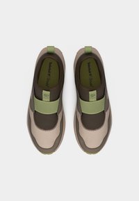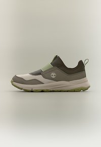 Χαμηλά αθλητικά παπούτσια σε πράσινο, καφέ και μπεζ με λαστιχένια σόλα και ελαστικό λουράκι, με το λογότυπο του δέντρου Timberland στο πλάι.