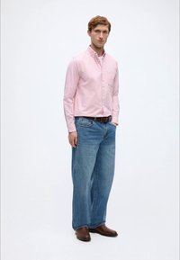 Ροζ ροδάκινο πουκάμισο με ρίγες, με κουμπιά, γιακά και μία τσέπη στο στήθος, κατασκευασμένο από βαμβάκι με απαλή υφή, συνδυασμένο με μπλε τζιν παντελόνι.