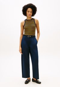 Παντελόνια σε σκούρο μπλε με φαρδιά παντελόνια, φορεμένα με μαύρα μοκασίνια που έχουν χρυσές αλυσίδες και ένα αμάνικο μαύρο και κίτρινο ριγέ τοπ.