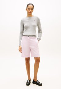 Ανοιχτό ροζ σορτς από μείγμα βαμβακιού, με πλαϊνές τσέπες και τελειώματα με μανσέτα, συνδυασμένα με μαύρα δερμάτινα μοκασίνια. Πάνω φορέθηκε γκρι πλεκτή μπλούζα.