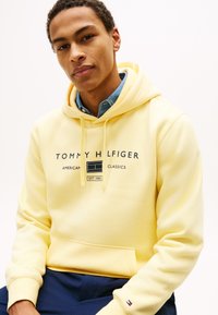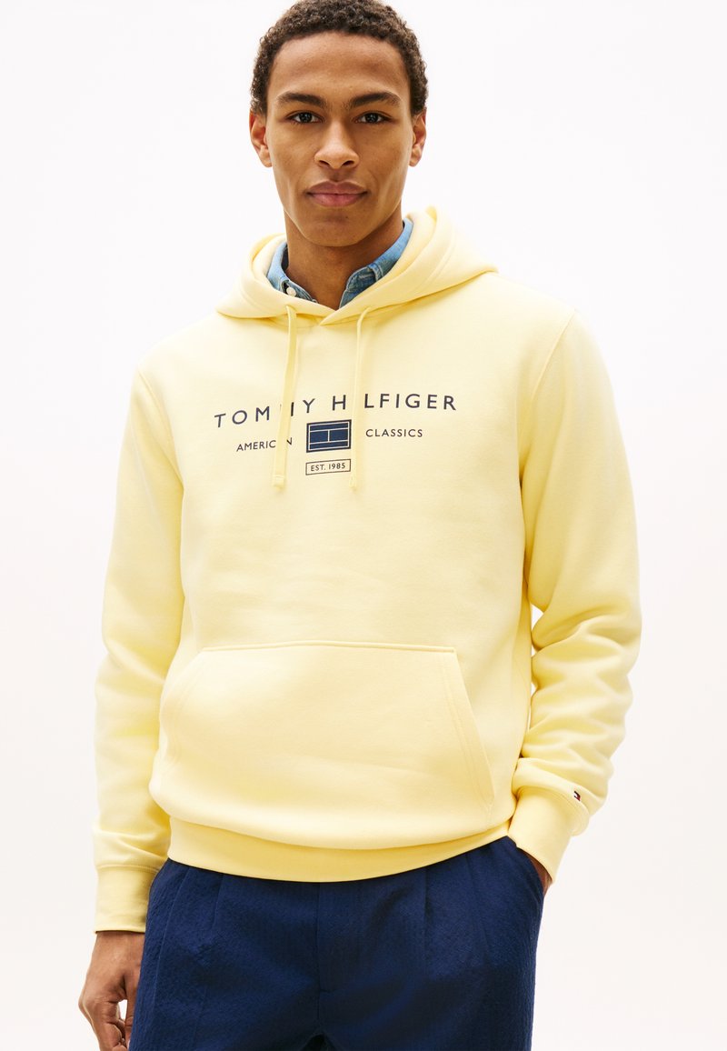 Νέος άνδρας που φοράει ανοιχτό κίτρινο hoodie Tommy Hilfiger με λογότυπο, μπλε πουκάμισο από κάτω και σκούρο μπλε παντελόνι, στέκεται με το ένα χέρι στην τσέπη.