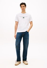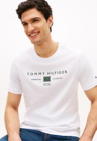 Νεαρός άντρας που φοράει λευκό μπλουζάκι Tommy Hilfiger με πράσινο κείμενο και γραφικά, με τα χέρια στις τσέπες, στέκεται μπροστά σε απλό φωτεινό φόντο.