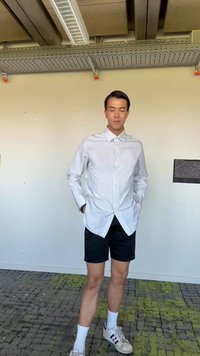 Ριγέ πουκάμισο με κουμπιά σε ναυτικό μπλε και λευκό, μαύρο σορτς, μαύρα λουστρίνι παπούτσια. Το πουκάμισο έχει μακριά μανίκια με μανσέτες.