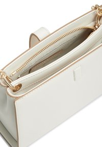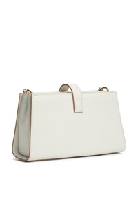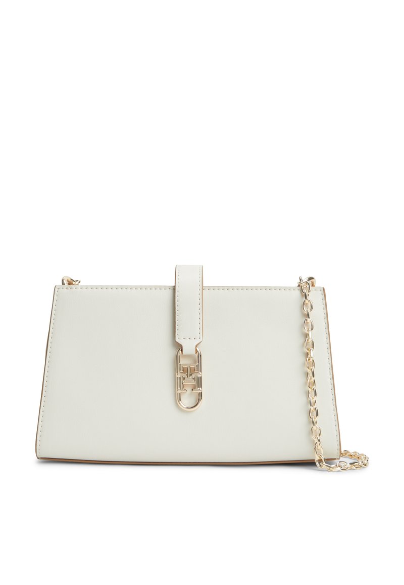 Λευκή ορθογώνια τσάντα χειρός με κούμπωμα σε χρυσή απόχρωση και αποσπώμενο λουράκι αλυσίδα, λεία υφή δέρματος, μινιμαλιστικός και κομψός σχεδιασμός.