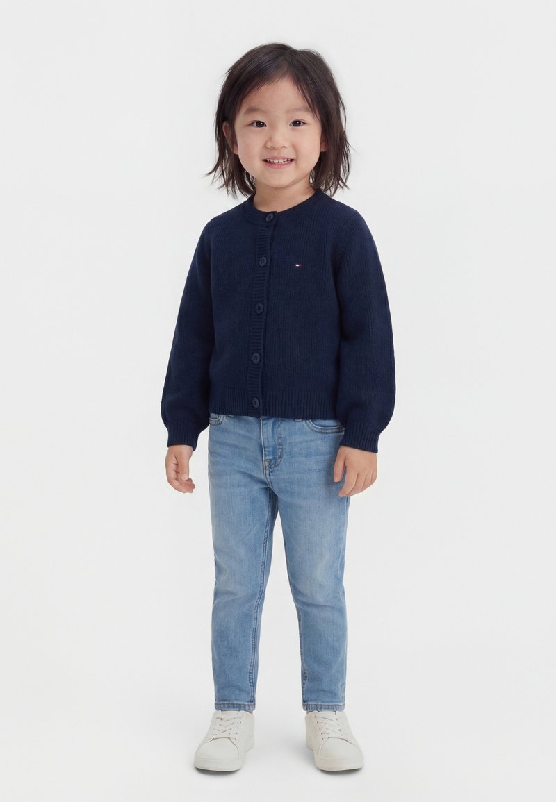 Παιδί στέκεται και χαμογελάει, φοράει μια ναυτική μπλε ζακέτα με κουμπιά, ανοιχτό μπλε τζιν και λευκά αθλητικά παπούτσια σε απλό φόντο.
