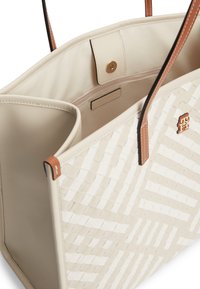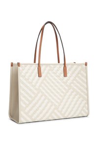 Γυναίκα με σγουρά μαλλιά που φοράει ένα μπεζ καμπαρντίνα, εκρού παντελόνι, λευκό πουλόβερ, καφέ μοκασίνια και κρατάει μια μεγάλη μπεζ τσάντα με σχέδια.