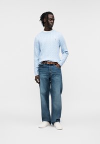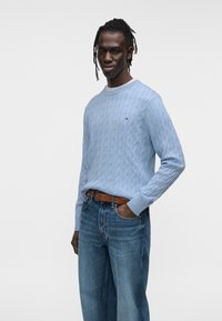 Ανοιχτό μπλε πλεκτό πουλόβερ με στρογγυλή λαιμόκοψη, συνδυασμένο με σκούρο τζιν και καφέ ζώνη. Διαθέτει ριμπ μανσέτες και μικρή λεπτομέρεια με λογότυπο.
