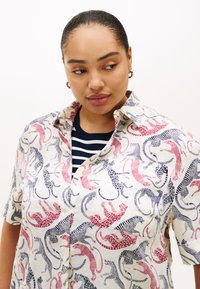 Μπλούζα με κοντά μανίκια από ελαφρύ ύφασμα με πολύχρωμο ζωικό μοτίβο σε κόκκινο και ναυτικό μπλε πάνω σε κρεμ φόντο, με κουμπιά.
