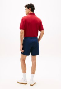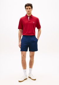 Άνδρας μοντέλο που φοράει σορτς σε ναυτικό μπλε με υφή, λευκές κάλτσες, λευκά αθλητικά παπούτσια και κόκκινο πουκάμισο, με τα χέρια στις τσέπες, στέκεται σε απλό φόντο.