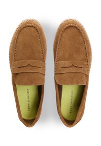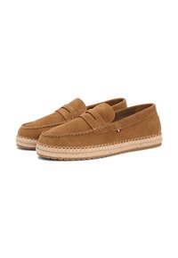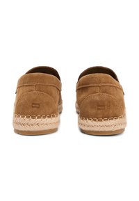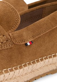 Καφέ μοκασίνι από σουέντ με πλεκτή σόλα εσπαντρίγιες και μικρό τριχρωματικό υφασμάτινο ετικέτα στο πλάι, σε στυλ χωρίς κορδόνια με διακοσμητικό λουράκι.