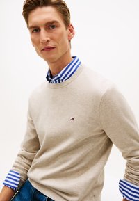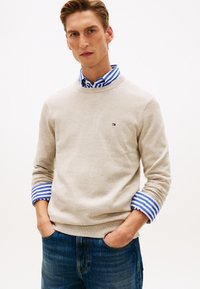 Μπεζ πουλόβερ με στρογγυλή λαιμόκοψη και ριμπ μανσέτες, φορεμένο πάνω από ένα μπλε και λευκό ριγέ πουκάμισο, σε συνδυασμό με σκούρο τζιν.