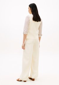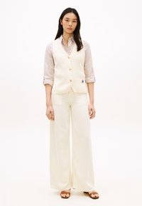 Γυναίκα με μακριά σκούρα μαλλιά, φοράει γιλέκο μπεζ με κουμπιά πάνω από μπεζ ριγέ πουκάμισο και ταιριαστό μπεζ παντελόνι, στέκεται με τα χέρια πίσω από την πλάτη.