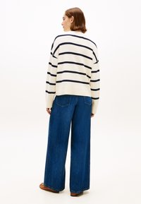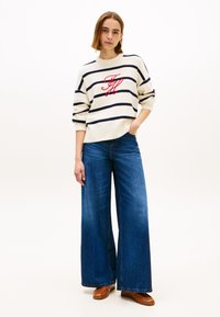 Πουλόβερ σε κρεμ χρώμα με ναυτικούς ρίγες, διαθέτει κόκκινο κεντητό λογότυπο, στρογγυλή λαιμόκοψη και άνετη εφαρμογή. Το σύνολο ολοκληρώνουν μπλε τζιν παντελόνια.