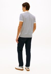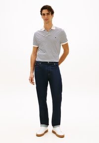 Ριγέ πόλο μπλουζάκι σε λευκό και ναυτικό μπλε, με κοντά μανίκια και επίπεδη γιακά, συνδυασμένο με σκούρο μπλε τζιν. Οριζόντιες ρίγες και λεπτομέρεια λογότυπου εμφανείς.