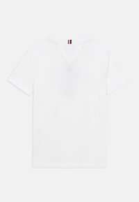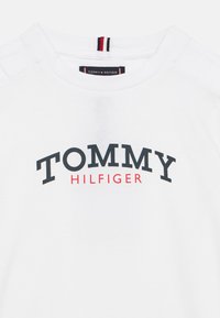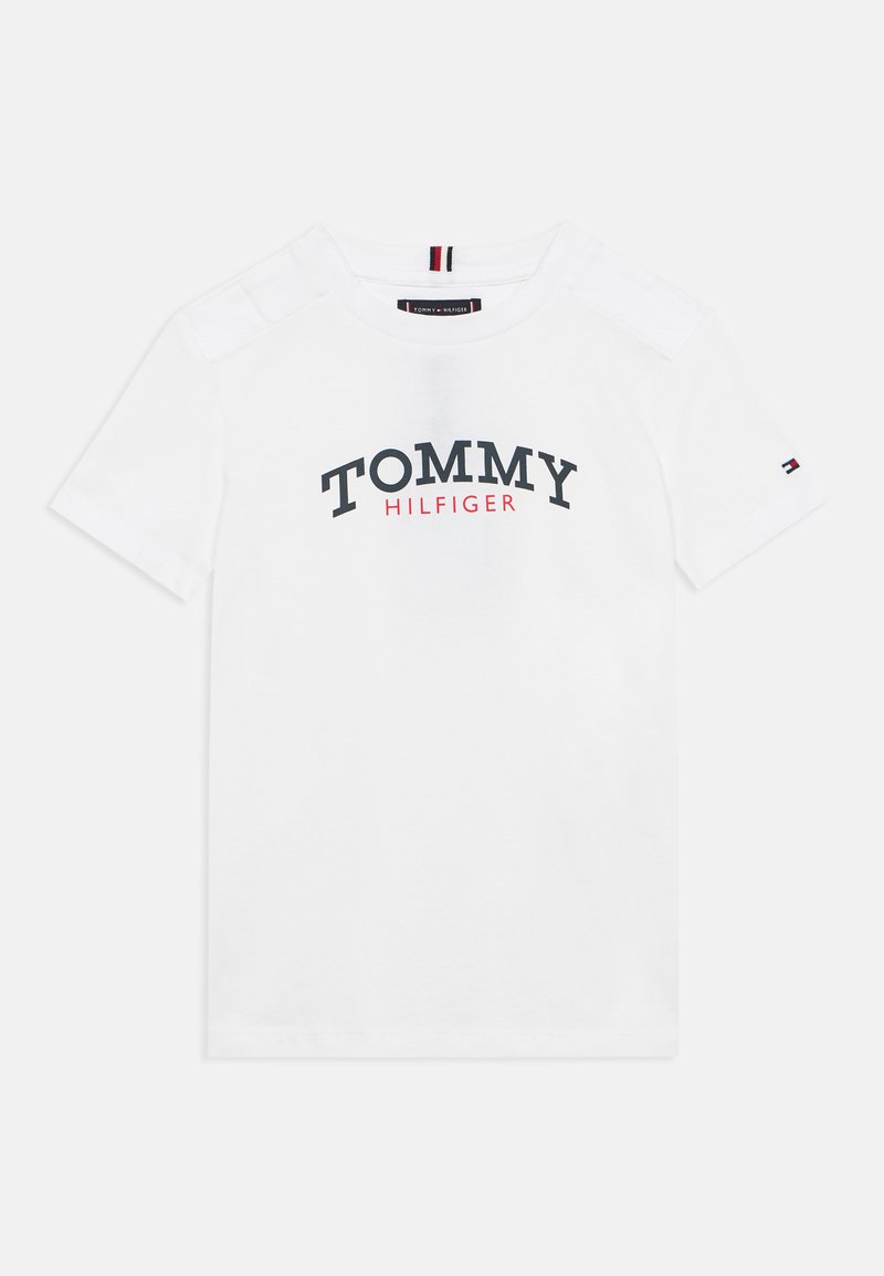 Άσπρο βαμβακερό μπλουζάκι με το λογότυπο "TOMMY HILFIGER" σε μαύρο και κόκκινο, με κοντά μανίκια, στρογγυλή λαιμόκοψη και διακοσμητικές ραφές στους ώμους.