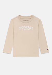 Μπλε ναυτικό μπλουζάκι για νήπια με μακριά μανίκια, με λευκό κείμενο "TOMMY HILFIGER" στο μπροστινό μέρος και μικρό λογότυπο στο μανικετόκουμπο του αριστερού μανικιού.