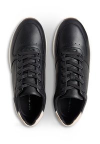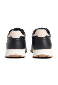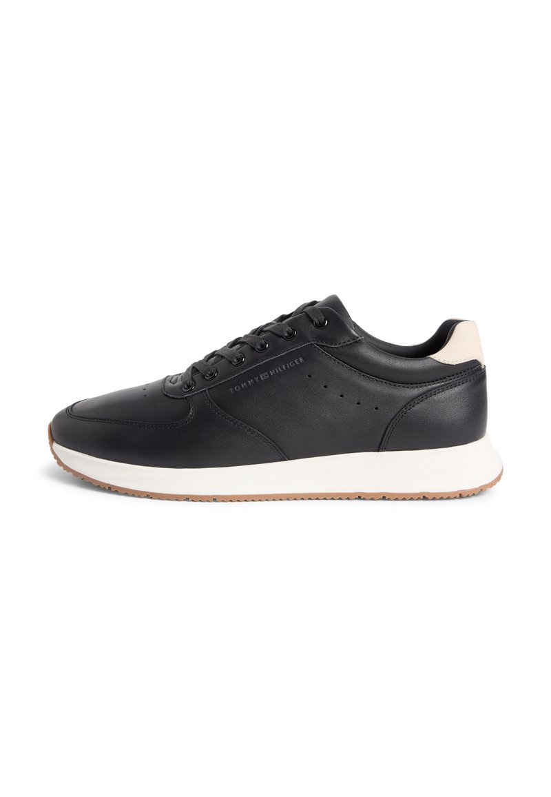 Μαύρο χαμηλό αθλητικό παπούτσι με λευκή σόλα, δετό σχέδιο, μπεζ λεπτομέρεια στη φτέρνα και διακριτικό λογότυπο Tommy Hilfiger στο πλάι.