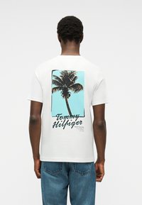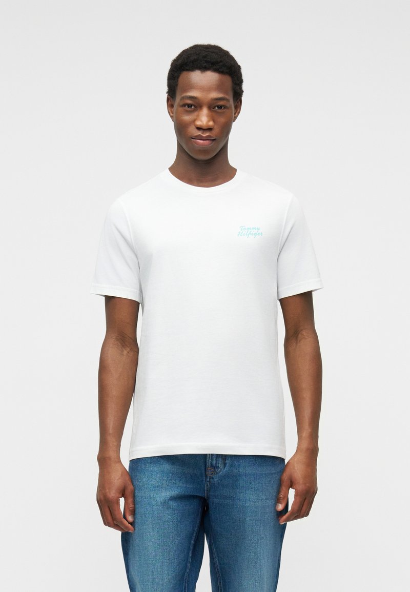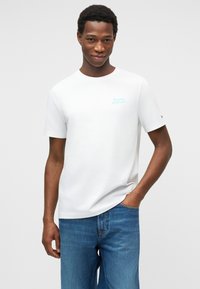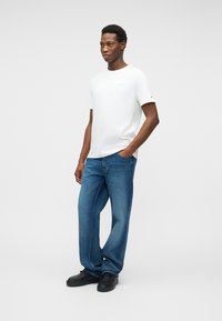 Νέος άνδρας που φοράει ένα απλό λευκό κοντομάνικο μπλουζάκι και μπλε τζιν, κοιτάζοντας μπροστά με ουδέτερη έκφραση σε απλό φόντο.