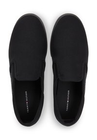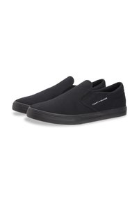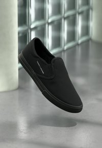 Μαύρο πάνινο παπούτσι τύπου slip-on με αδιάκοπο σχέδιο, λαστιχένια σόλα και διακριτική σήμανση στο πλάι· μινιμαλιστικό στυλ χωρίς κορδόνια.