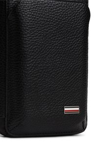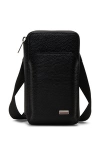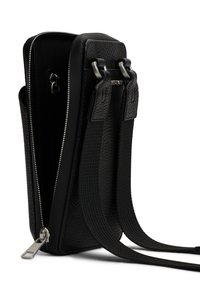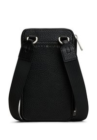Μαύρη τσάντα χιαστί από δέρμα με υφή, με μπροστινή τσέπη, ασημένιο φερμουάρ, ευρύ μαύρο λουρί και μικρή ορθογώνια πλακέτα με λογότυπο.