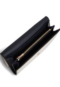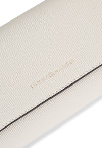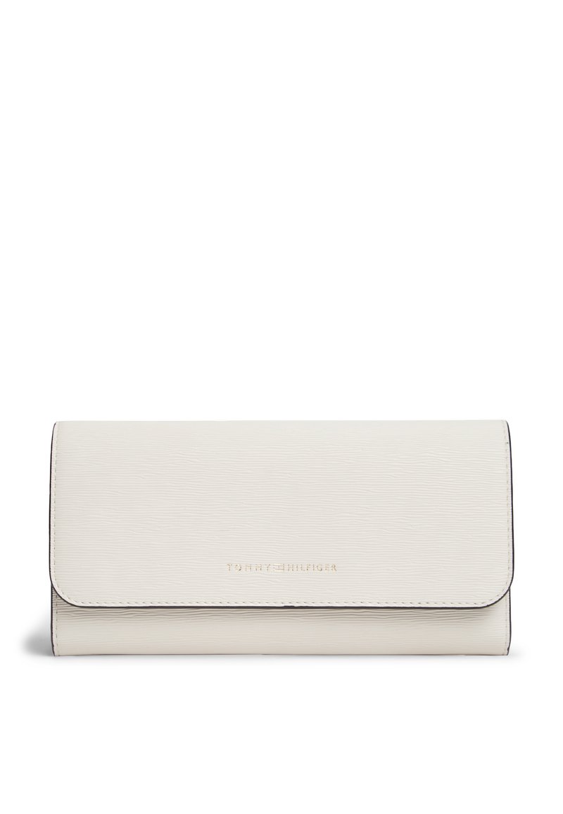 Λευκό δερμάτινο πορτοφόλι με υφή, με κλείσιμο με καπάκι και ανάγλυφο λογότυπο της μάρκας σε χρυσό τόνο στο εμπρόσθιο μέρος.