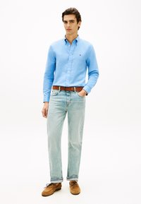 Άνδρας που φοράει ένα ανοιχτό μπλε πουκάμισο με μικρό λογότυπο, μπατισμένο μέσα σε ανοιχτό μπλε τζιν με καφέ δερμάτινη ζώνη, στέκεται με το ένα χέρι στην τσέπη.