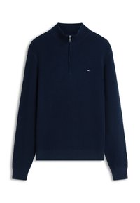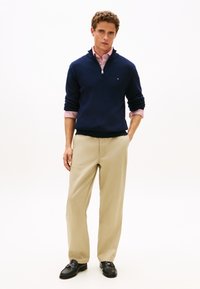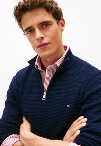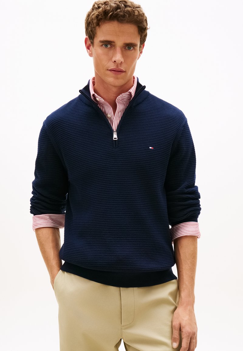 Μπλε σκούρο πουλόβερ με φερμουάρ και υφασμένο μοτίβο, σε συνδυασμό με κόκκινο και λευκό ριγέ πουκάμισο με γιακά, και μπεζ παντελόνι.
