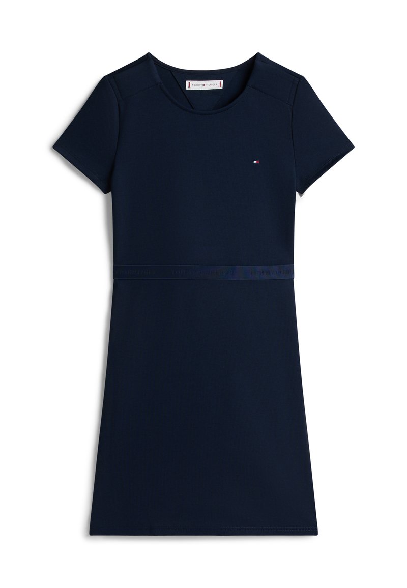 Κοντό φόρεμα σε ναυτικό μπλε με κοντά μανίκια και στρογγυλή λαιμόκοψη. Διαθέτει υφή υφάσματος και αντίθετη μέση με λογότυπο πάνω από το τελείωμα.