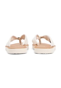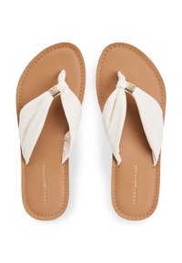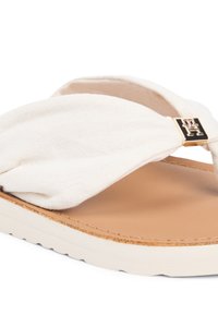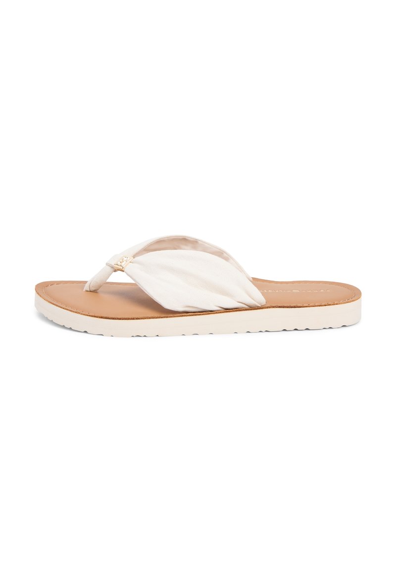 Πέδιλο από μπεζ ύφασμα τύπου σαγιονάρα με επενδεδυμένο λουρί, ταμπά πέλμα και ανοιχτόχρωμη σόλα, εμφανιζόμενο από το πλάι σε λευκό φόντο.