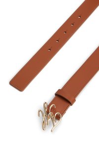 Καφέ δερμάτινη ζώνη με ομαλή υφή, που διαθέτει αγκράφα διπλού αρχικού γράμματος σε χρυσό τόνο. Η ζώνη είναι φαρδιά, με κλασικό σχέδιο και καθαρές άκρες.