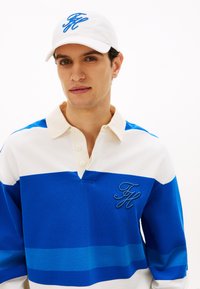 Νέος άνδρας που φοράει μπλε και λευκή ριγέ ράγκμπι μπλούζα και λευκό καπέλο με μπλε κεντημένα αρχικά FH.
