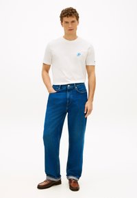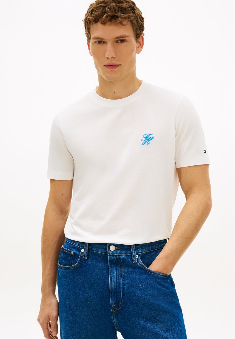 Νέος άνδρας φοράει λευκή κοντομάνικη μπλούζα με μπλε μονόγραμμα και μπλε τζιν, στέκεται με το ένα χέρι στην τσέπη, πάνω σε λευκό φόντο.