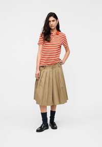 Γυναίκα με μακριά σκούρα μαλλιά, ντυμένη με πορτοκαλί και λευκή ριγέ πόλο μπλούζα και μπεζ πλισέ φούστα, στέκεται μπροστά σε απλό φόντο.